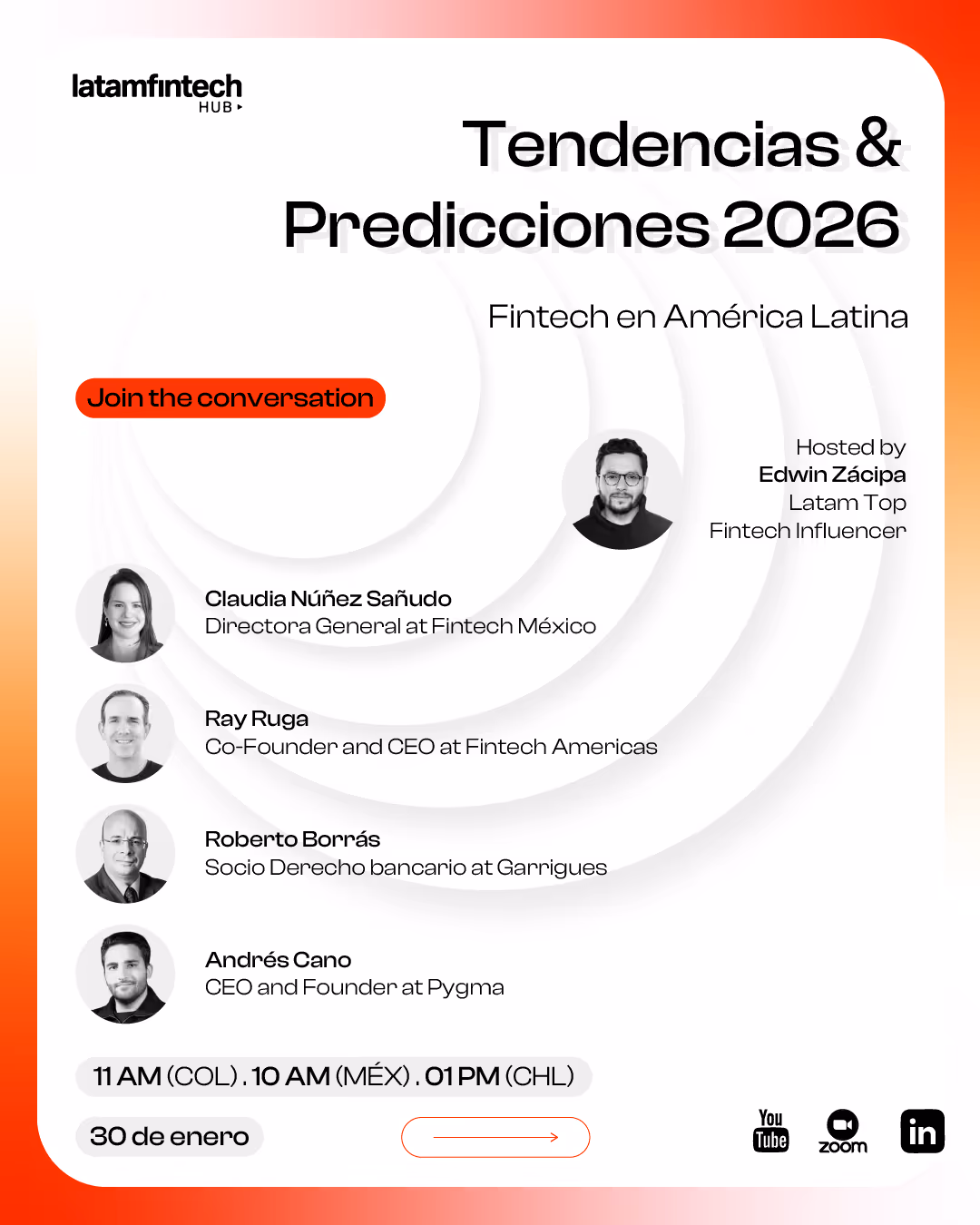 Hablaremos de pagos, Open Finance, regulación, modelos de negocio y adopción tecnológica, con foco en lo que ya se está moviendo en mercados como México, Colombia, Chile y la región en general.