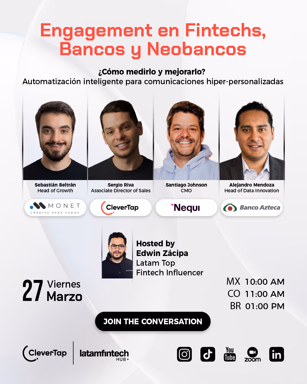 En un entorno donde la competencia por la atención del usuario es cada vez mayor, el engagement se ha convertido en un factor crítico para Fintechs, Bancos y neobancos. Ya no se trata solo de adquirir usuarios, sino de construir relaciones relevantes, medir interacciones de forma inteligente y activar estrategias que realmente impacten la experiencia financiera digital. En este webinar, junto a expertos de CleverTap, Nequi, Monet y Banco Azteca, exploraremos cómo medir y mejorar el engagement, y el papel clave de la automatización inteligente y las comunicaciones hiper-personalizadas en este proceso. Una conversación para entender qué métricas importan, cómo optimizar cada punto de contacto con los usuarios y qué están haciendo las instituciones líderes para aumentar la retención y el valor a largo plazo.